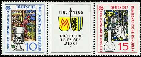 | Leipziger Stadtwappen mit Messezeichen; Schwermaschinenbau, Erdkugel, Friedenstaube |